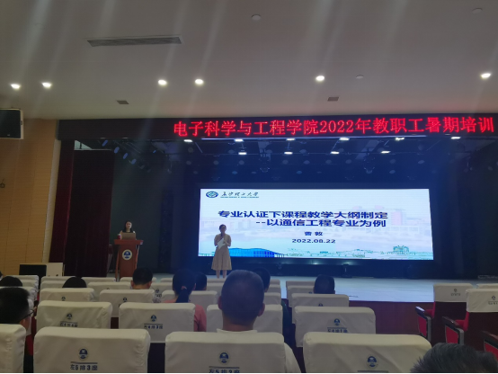 为全面推进我院专业建设,推进工程教育专业认证,在学校2022版人才培养方案修订基本完成之际,2022年8月23日,学院邀请了长沙理工大学通信工程系主任曹敦副教授在国际会议中心开展了主题为“专业认证下课程教学大纲制定-以通信工程专业为例”的专题讲座。会议由学院副院长张金菊主持,学院全体教师参加了此次培训。